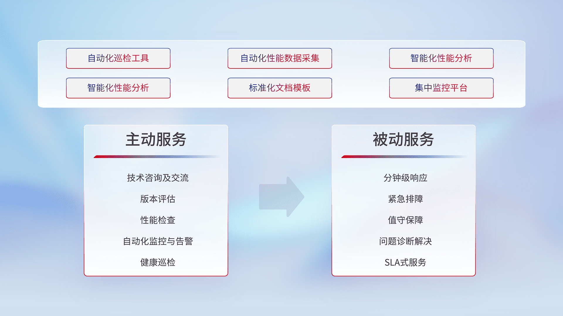智能化工具和标准化文档,,,,保障服务质量,,提供主动服务(包含技术咨询、、、版本评估、、、性能检查、、、、自动化监控与告警、、、、健康巡检)和被动服务包含(分钟级响应、、、紧急排障、、、、值守保障、、、问题诊断解决、、SLA服务)。。。。